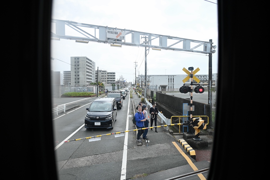 Midway along the spur, the train made a brief stop, lowered its pantographs, and switched to battery power; the cabin lights changed to emergency lighting, leaving the interior dim. Remaining on battery self-propulsion, the train passed the only level crossing on the Tokaido Shinkansen (Nishi-Iba No. 1 Crossing) and arrived around 1:00 p.m. at Track 2 of the maintenance shop inside the Hamamatsu Works.