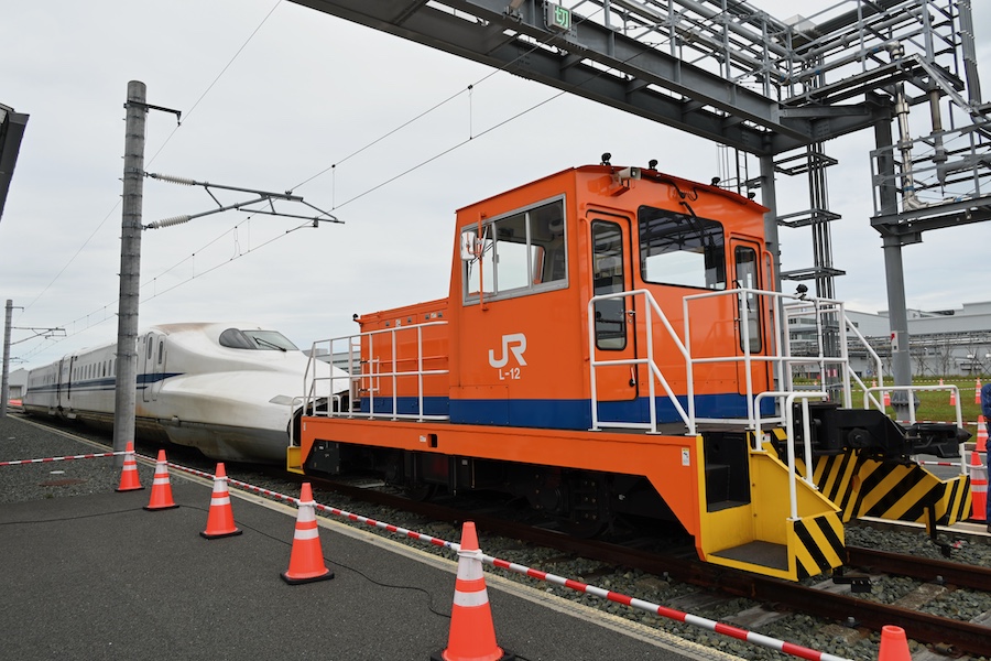 The star exhibit on site was the “shortest Shinkansen(?)”: two leading cars from retired N700A set X51 coupled back-to-back. As each leading car is 27.35 meters long, the two-car consist measures about 54.70 meters; by comparison, a standard Shinkansen trainset is 16 cars and about 404.70 meters long. Propelled and towed by the L12 shunting vehicle, it also ran back and forth on yard tracks at 5 km/h.