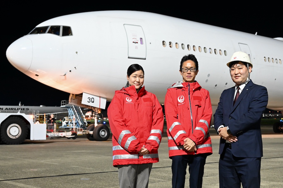 ▲Those in charge of arranging the ferry flight (from left): Misaki Yoshida and Takahiko Tsuchiya, JAL Business Aviation, Airport Business Department; and Takuya Kutsuzawa, JAL Aircraft and Maintenance Procurement Department, Maintenance Group