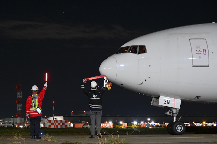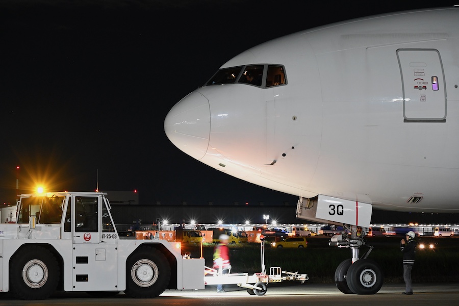 With the JAL crane logo and other markings removed, the now all-white aircraft pushed back from Spot 212 in front of the JAL hangar at 11:47 p.m. on November 10 for its ferry flight. Waved off by JAL staff holding penlights, it took off from Runway C at 12:01 a.m. on the 11th.