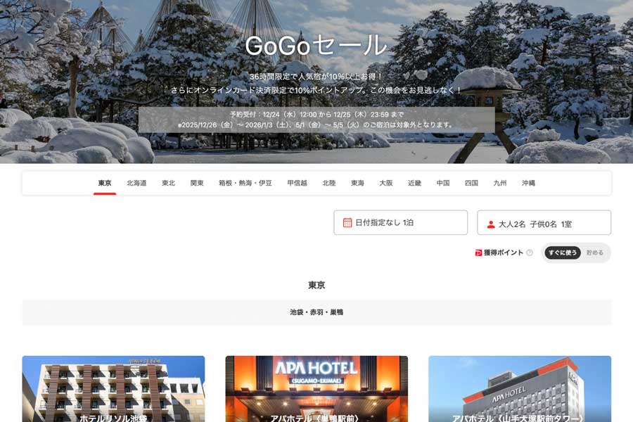 LINE Yahoo is holding a “GoGo Sale” on its travel booking site “Yahoo! Travel” from noon on December 24 through December 25.