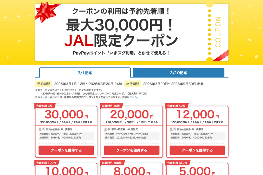 LINE Yahoo has begun distributing “JAL Limited Coupons” on the Japanese travel booking site “Yahoo! Travel (Yafu Travel)” starting March 1.