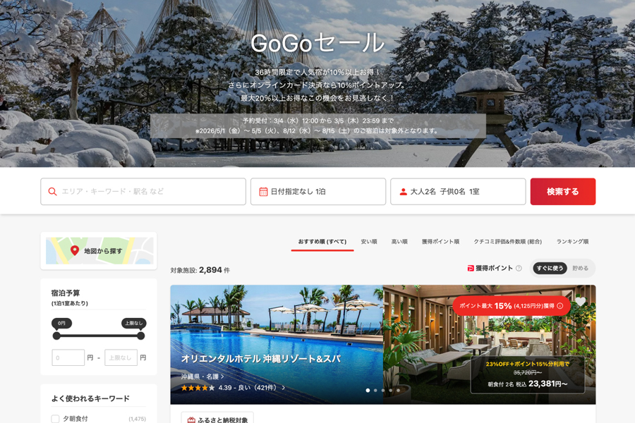 For 36 hours only, popular accommodations are discounted by 10% or more, and an additional 10% in reward points is granted for online credit card payments. The Japanese Golden Week period from May 1 to 5 and the Obon holiday period from August 12 to 15 are excluded.