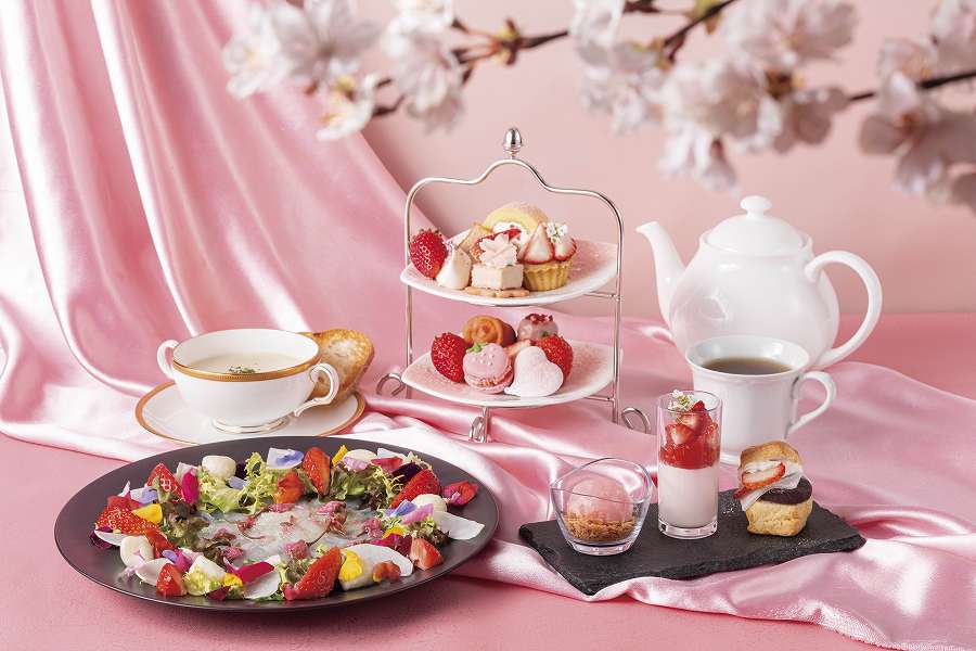 The sweets include 11 items: “Strawberry Cheesecake with Tonka Bean Flavor” topped with chocolate shaped like cherry blossoms, “Strawberry Daifuku Scone” with gyuhi (soft rice cake), smooth red bean paste, and fresh cream sandwiched in a scone, milk pudding with a condensed-milk flavor and a hint of cherry blossom aroma served with strawberries and strawberry jelly, cherry blossom chiffon cake, strawberry tart, chocolate canelé, financier, macaron, roll cake, Tochiotome strawberry ice cream, and guimauve fraise (strawberry marshmallow). Savories made with seasonal ingredients include three items: sea bream carpaccio marinated with salted cherry blossoms, a salad of strawberries, mozzarella cheese, and spring turnip, and potato potage. A “Strawberry Dessert Stand,” where you can enjoy only the sweets, is also available.